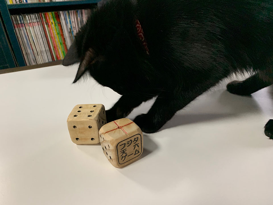 更に、編集部には7月から猫がいるので、アクシデントも起こる。僕らは、猫がサイコロを場外に出した場合は自然現象と考え、1回と数えることにした。猫を味方に付けた方が有利となり面白さ倍増である。