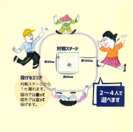 ルールは至極簡単である。4・5センチ角のオリジナルのサイコロを2個使い、1メートル離れた90センチ四方の対戦ステージ(枠内)に5回投げて、出た目の合計点を競う。枠内に入らなかった場合は無効となりカウントしない。室内では、対戦ステージに風呂敷を使うと便利だ。