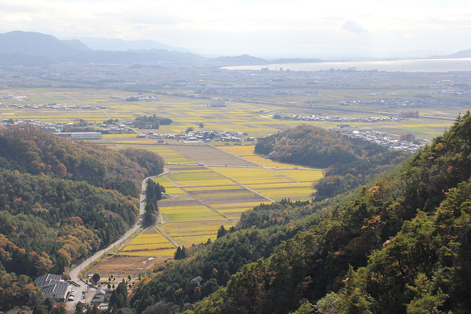 一日回峰行の参加証は名刺を一回り大きくしたサイズのルートマップだった。マップによると見えているため池は〝西池〟で、全国ため池百選とある。温泉施設の屋根が見える須賀谷町は国道365号線から随分と奥まっていて、長く伸びた尾根筋に挟まれるようにあり、山々の稜線がきれいに見えるのは好天気のせいだろう。遠くに見える琵琶湖は銀色に輝いている。以前、小谷山に登ったのは、小谷城戦国歴史資料館がある小谷郡上町側からだった。その時も眺望を楽しんだが、絶景の岩場は今回初めて知った。帰り道の須賀谷町を右手に見て下る尾根道にあり、難コースだがロープにも助けられて下りきることができた。