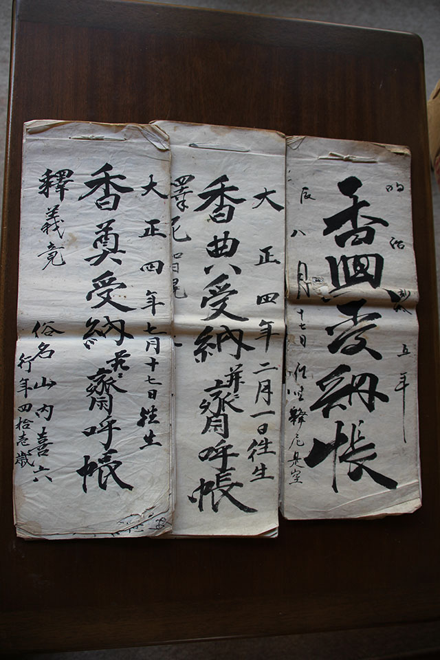 明治20年に作られた帳面には、〝あなほり〟という役があり、当時は土葬だったことがわかる。香典は米で、一升とか五合などと記されている。