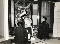 次は〝結納〟で、新郎の家から新婦の家に持参され、文房具店では結納用品一式が揃い、目録などを書くサービスもあった。和子さんは「結納一式は箱に入っていて、それを包むのに家紋入りの一反風呂敷と小ぶりの風呂敷が要りましたんや」。新婦の家では受領書を書き、新郎の家へ届けられた。「必ずではないですが、〝衣装見せ〟というのもありました」。それは新婦の家で、親戚や友人の女性が集まり、結婚に向けて準備された着物や箪笥などの調度品をお披露目するイベントなのだそう。