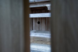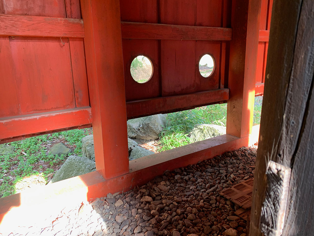 もうひとつは、飯開神社(長浜市湖北町延勝寺1251)。Fox Holeが2つある社に出会ったのは初めてである。八雲も見たことはないだろう……とドキドキした。しかも、社は雪囲いで二重になっているのだが、外側にもちゃんと2つの穴があいているところがいい。何故、飯開神社の稲荷社には2つの穴が設けられたのか……、今のところ、これといった仮説も思いつかないでいる。ぜひ知りたいものである。
