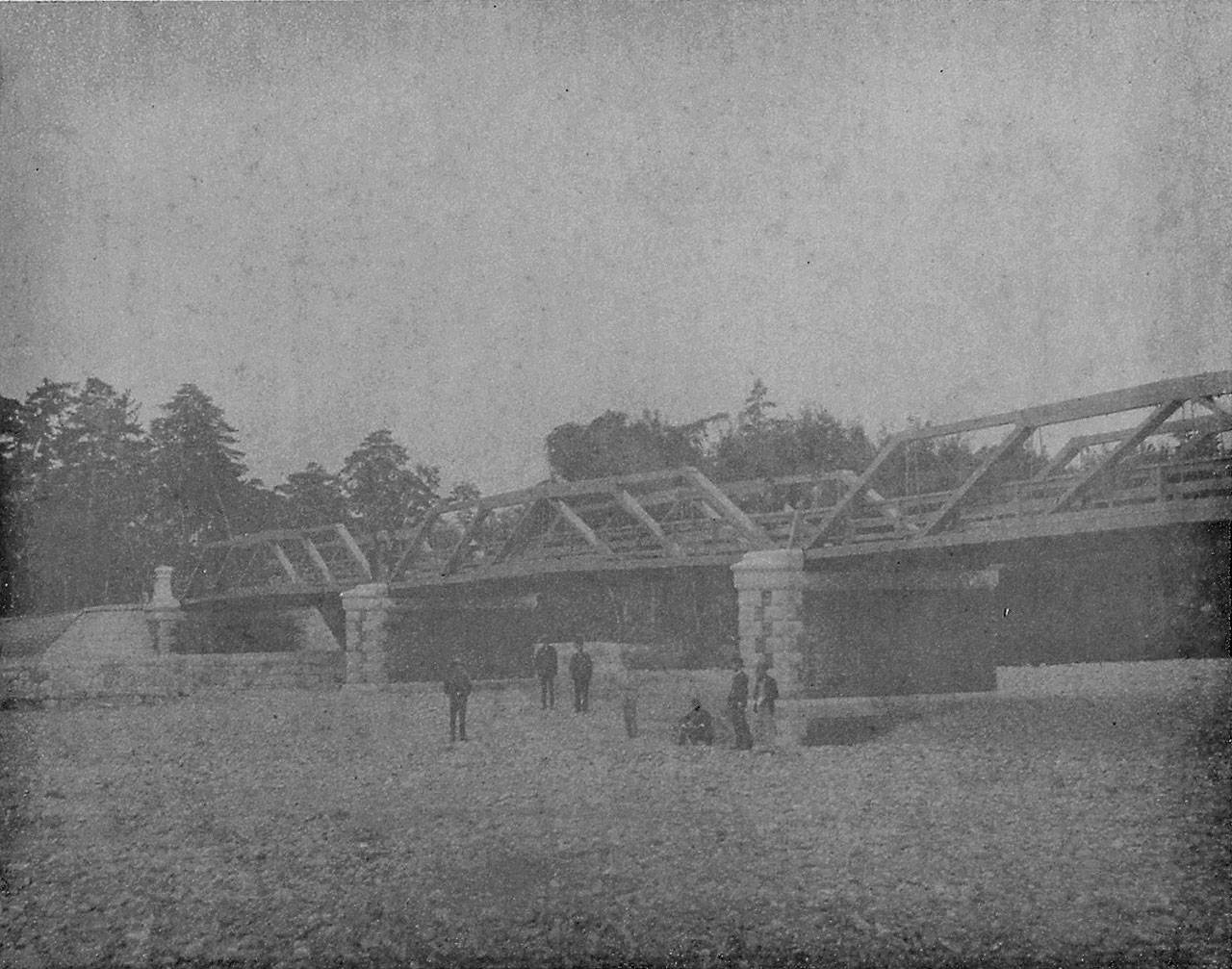 明治11年(1878)明治天皇の御巡幸のために馬車の通る板橋が架けられ、無賃橋(太平橋)の名前が「御幸橋」と改められた。その後、幾度か流失と再架を繰り返し、明治24年(1891)に竣功したのが写真の木造トラス橋である。