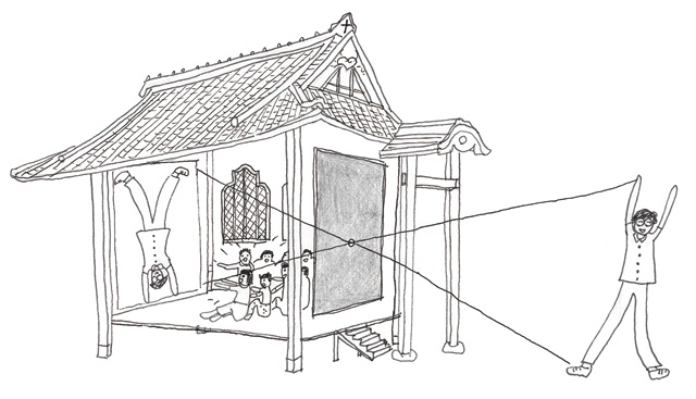 『お堂を真っ暗にする→穴を作る→光が入る→お堂内部に逆さまの景色が映る→暗い部屋で映った光景を見て楽しむ』。