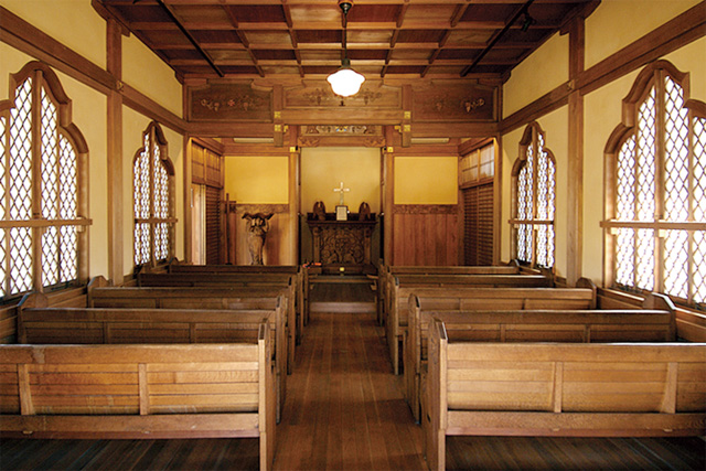 記念堂は、昭和6年、アメリカ人牧師で彦根高等商業学校(現滋賀大学経済学部)の英語教師だったパーシー・A・スミス氏が日米両国の交流を願い建てた全国的にも珍しい和風礼拝堂だ。