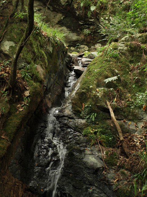 山道の途中から見ると、流れは何段かを経て滝つぼに落ちる様子がわかる。滝を覆うような木々のなかに、まだ緑色の紅葉の葉があった。滝が赤く染まる風景を見たいと思った。