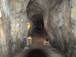 旧近江町、岩脇の集落に岩脇山というこじんまりとした山がある。藤子・F・不二雄の漫画ドラえもんでのび太がよく昼寝をしている裏山、といった感じだろうか。ただし岩脇山には大きな横穴がふたつ、ぽっかりと口を開けている。山の南東、JRの電車や貨物列車が定期的に通り過ぎるのがよく見えるあたりだ。かつて、この山にSLの防空壕を造ろうと試みられたことがあった。穴はその遺構だという。横穴はおよそ幅3メートル、高さは最大で5メートルだ。1本は貫通し130メートルの長さがある。もう1本は途中まで掘り進められた状態で行き止まりになっている。穴のなかは電気が灯され、影のせいたろう……、ごつごつとした岩肌が浮き上がって見える。冷たい空気が流れ、上から染み込んだ雨水が水たまりをつくっている。SLを収容するには小さすぎると思うのは、防空壕は完成することなく終戦を迎えたからだ。ここにSLが入ることはなかった。