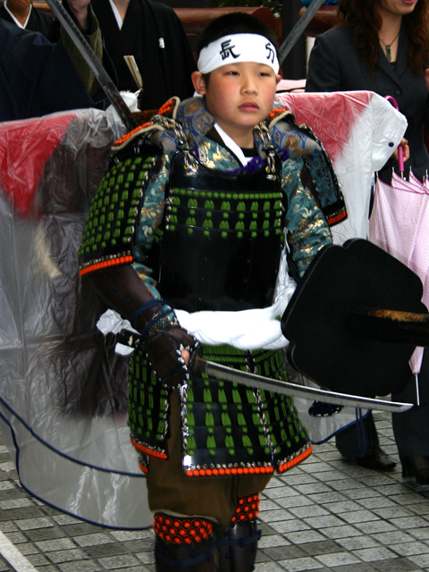まつり本日の朝、八幡宮では長刀組の太刀渡りの行列に続き「翁招き」という儀式がある。長刀組の一人が「最初 長刀組」と記された札をはさんだ竹竿を、神前に向かって振り、曳山の方へ向ける。ちょっと風変わりで一見、何を意味するかわからない。これは長刀組の退出と同時に子ども歌舞伎のスタートの合図で、翁は神様の移し身なのだという。