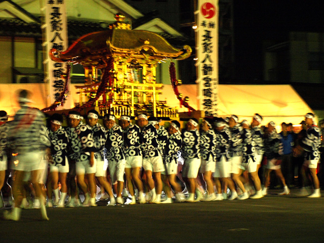 もうひとつ、まつりでは八幡宮から御旅所への神輿の往復がある。これは秀吉が八幡宮を復興する以前からあった、春と秋の神事で、現在では春の方が曳山まつりと同時に行われている。
