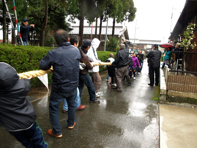 いっこうに天気は回復する気配はなく、つかの間の少雨をみはからって最後の大綱引きが行われることになった。集落を巡回しながらではなく、神社近くでのみと変更された。女性側に男性も混じる。いつの年も豊作がいいという願いのあらわれだ。数回の勝負を経て、女性側の勝ちが決まった。はしごを使って縄が木にかけられる。1年を通して縄が切れたことは一度もないと誰かがいえば、いや大雪のときに切れたでという声がする。