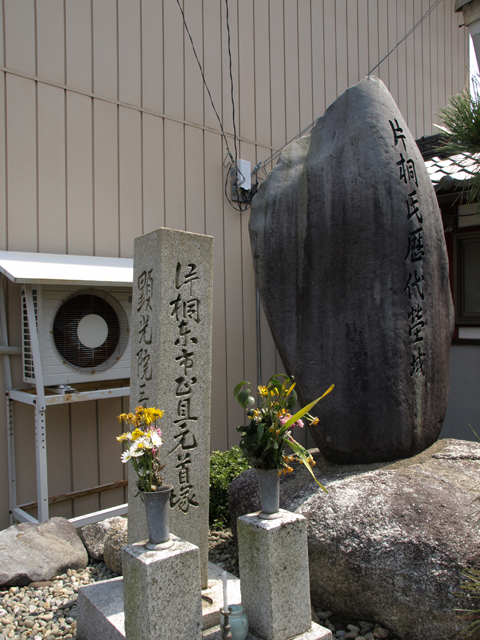 JR高月駅の西側、入り組んだ路地の一角に石碑がある。片桐且元の首塚である旨が記されている。歴史好きなら首をかしげるだろう。一般に且元は駿河の国で死去したといわれているからだ。