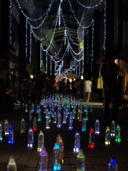 今年で11回目、テーマは「ヒカリのミチシルベ」。黒壁ガラス館の「ベッラ・ストラーダ」という灯りのイベントも同日開催される。大手門通りと交わる博物館通りでも手づくりの灯りのオブジェが並び、旧長浜市街地一帯がいつもとは違った雰囲気に包まれた。長浜西中2年生がペットボトルとLEDを使ったオブジェを製作したり、かき氷や焼きそばなどのチャリティー屋台を出店、募金に歩く姿が印象的だった。