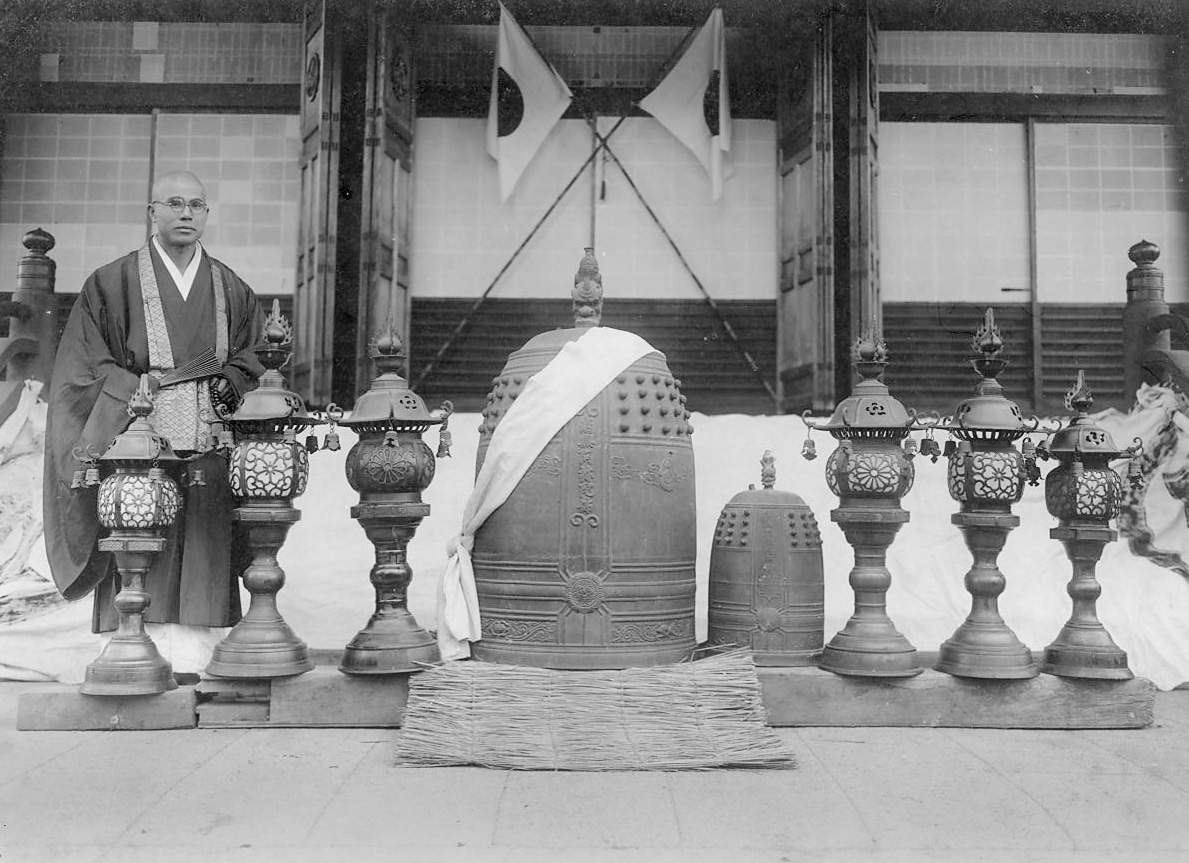 常光寺の梵鐘は「暁、夕べ、声を発して、十方に至る」といわれ、一里四方に響き長夜の夢を破る名鐘だった。昭和18年、太平洋戦争のため供出、帰らぬものとなった。写真は梵鐘供出当日に撮られたもの(常光寺蔵)。現在の梵鐘は檀家の均等喜捨と信徒・縁者の寄付により鋳造された3代目となる。