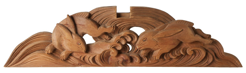 午前9時を少し過ぎた頃、事務所を訪れた友人が「こんなものに価値を見出して、喜んでもらえるのは君だけだ」というのだ。この文様は相変わらず実にキュートである。友人は、春祭りの準備の際、神社の古くなった物を捨てる係をしていたそうだ。「燃えるものは、宵宮のかかがり火にほり込んでしまえ」という指示だったらしい。そうしたら、写真の波うさぎの木の彫刻が出てきた。それを見て、僕を思い出し、後生大事に抱えて持って来てくれたのだ。燃やされる運命にあったとしても、僕にとっては宝物である。無茶苦茶に嬉しくて仕方なかった。勿論、些細な話を忘れず、ゴミの中から文様を見いだし、届けてくれた友人の心遣いにである。
