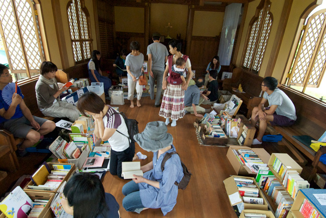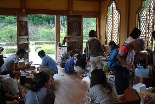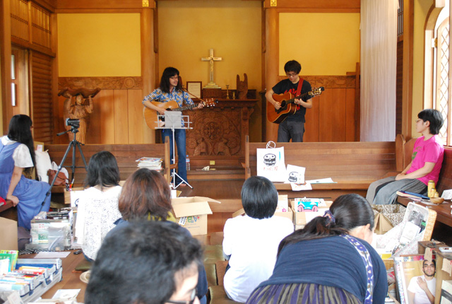 8月21日にスミス記念堂(和風礼拝堂・彦根市本町)で行われた「ウモレボン市」(主催:ひこねウモレボン市実行委員会・委員長御子柴泰子さん)は、訪れる人の波が途切れることはなかった。主催者によると16の出店と映画の上映、ポーの一族によるライブが行われ、閉館までに約100人の来場者があった。
