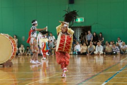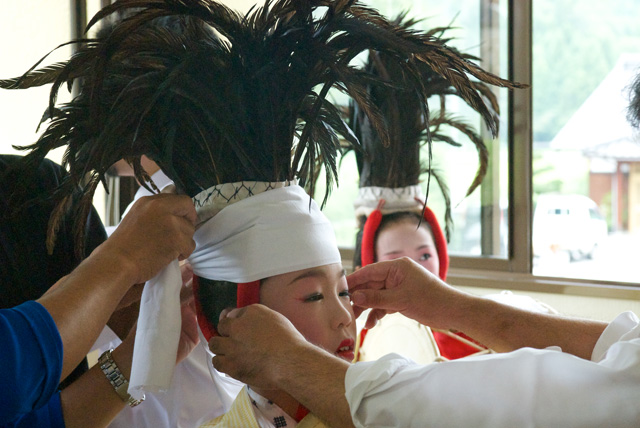 当日、午前中から空の模様はあやしく、下余呉の乎彌神社境内で奉納される太鼓踊りは、余呉体育館で行われることになった。本来、みちゆき・ぎおんばやし・五つさがりなどの節に合わせた踊りは、余呉の山々を背景に場面が展開するのだろう。
