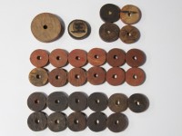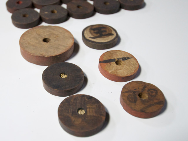 玉は赤12個、黒11個、王1個、手玉4個、そしてひと際大きな玉が1個という組み合わせだ。カロム盤に関しては、所有者と製造年の墨書があり、時代を遡る手がかりが残されているが、玉に関しては、どれくらい昔のものなのかは判断する術が無い。玉は失われやすく、盤と共に玉を見つけることはほとんど無い。古い玉が1セット出てきたのはこれが始めてと言っていい……。今後、玉に関しても収集の必要を感じている。玉もまた実に魅力的なのである。