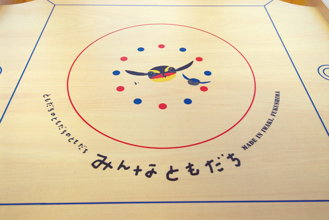 カロムに関する知識は全くなかったそうだ。『カロムロード』(杉原正樹編著 / サンライズ出版)を読んで勉強し、カロム盤の試作を繰り返し、良いものを作ろうと2ヶ月を費やしたという。家具屋さん、木工所さん、印刷屋さん、障害者施設のみなさん、建築関係の方、主婦の方々が集まっての製作だった。盤の中央には、絵本作家の村上康成さんが描くプロジェクトのシンボル「福島に生息する鳥のキビタキとオオルリ」が描かれている。赤と緑それぞれ12個でゲームをするのが当たり前の僕らにとって、それぞれ6個でゲームができるように工夫してあるなど、デザインそのものがオリジナルだった。驚きは、玉(パック)。障害者施設のみなさんの手作りで、ひとつ一つ面取りして仕上げてあるのだという…。詳しく書くことはできないが、ルールもオリジナルだ。
