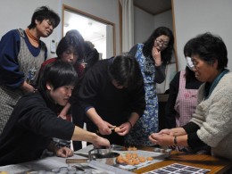 震災復興支援商品「ほたてあかり」の本格的製造は12月から始まった。毎朝9時には皆仮設住宅に集まり作業が始まる。玄関には所狭しと長靴が並んでいる。「まだ、早いんでねぇか?」「大丈夫だいっちゃぁ」「ほら、上手く出来たぁ」「今朝、アンコウ獲れたってよぉ。とうちゃんが言ってたぁ」。6畳2間と台所に10人ほどの女性たち。浜の女性の働きぶりは、見とれるほどのスピードである。会話が飛び交い、今まで見た中で一番いきいきとした笑顔がある。