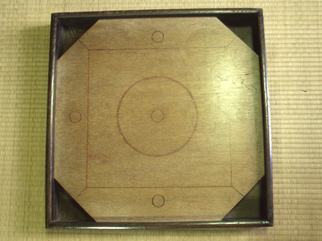 ところで、一つだけ気になっていることがある。実は、旧川原町郵便局舎には、明治時代と推測されるカロム盤があった。現存する最古の彦根のカロム盤である。61センチ角の正方形で、ポケットは16センチ×8.5センチ(底辺×高さ)の三角形。現在のものと比べると少し小さい。盤面の木が痩せて木目が浮き上がり、平らにするためにロウ紙を貼って使われ、その後、更にベニヤ板を張り遊びつがれたという代物である。この盤の行方が判らなくなっている。多分、何処かにあるのだろうが。