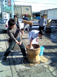 3人は餅をつくのが異様に速い。6年前「全国もちつき王選手権」というテレビ特番に出場、蒸したもち米2升を臼に入れてから餅状になるまでの速さを競い、1分44秒の記録を出した。家庭用の餅つき機を使ったことがあれば、それがどれほど速いかわかるはずだ。番組ではさらに餅つきに関するいくつかの技を競い、準優勝に輝いた。 役割分担は、津田さんと西川さんがつき手、辻井さんが手返しと決まっている。なぜ、それほどまでに速く餅をつけるのか…極意のようなものがあるならぜひ伝授してほしいと思っていた(私は速くつく必要はないのだが)。3人とも集団を作るまでは、臼と杵での餅つきには縁がなかったというから経験ばかりではないはずだ。