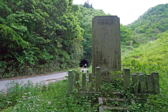 米原市側から隧道入り口まで歩く……。途中に真新しい石碑があった。『横山隧道創始者 高森慶多郎之碑』。高森慶多郎は明治5年(1872)2月26日に東黒田村に生まれ、28歳の時に横山峠の改修・隧道建設を決意。県議会に要請を繰り返し、大正8年にようやく実を結んだが、慶多郎自身は完成を見ることなく病没したらしい。石碑は記憶を留める装置として、振り返ろうとする者にとって実にありがたい。