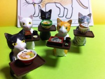 ざるそばや天丼、きつねうどんなどは「出前シリーズ」、エビフライやオムライスなどは「洋食シリーズ」と呼ぶ。他に10センチ四方の「ドールブース」と呼ぶシリーズもある。これは駕籠に盛られたリンゴの写真からイメージを膨らませ、リンゴの駕籠が置かれた部屋の一角を作り上げたのが最初だと教えてくださった。きっと、物の取り合わせの絶妙さにもその人らしいセンスが伺えるのだろうと思う。近作には猫のフィギュアもあり、手にしたお盆に出前シリーズの一品を載せて、「お給仕猫」にして見せてくださった。