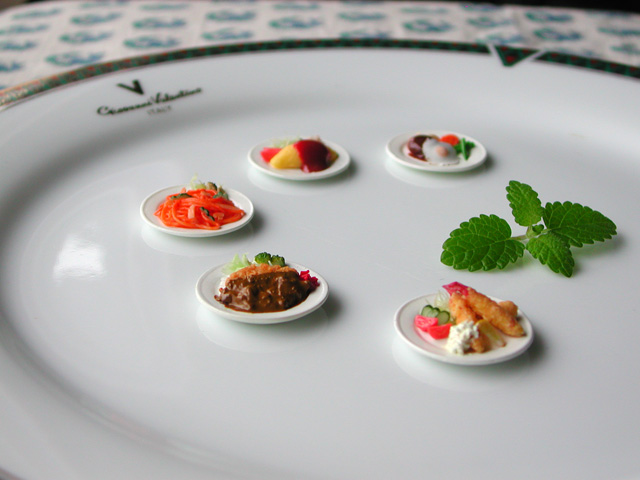初期の作品という「天ぷら盛り合わせ」と、近作の「天丼」を見比べると、確かにエビのしっぽの色合いや衣の質感に違いがある。作品を納めた小箱の中は、完成品とパーツの数々がきちんと整理されていて、大越さんはピンセットで取り出しては、セットして見せてくださった。虫眼鏡を添える心配りも流石だ。