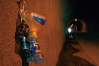 しかし、実際はトンネル内に投げ捨てられた空き缶やペットボトルを放置するには忍びなく、誰かが始めたのだろう。或いは一旦、こうして吊しておいて、一気に回収する作戦だろうか。それならば分別してあるはずだが……。やはり、手間のかかる結わえ方からしても、心ある人の仕業だろう。この隧道のオブジェの製作者に会ってお話を聞いてみたいと思った。ご存知の方に編集部までご一報いただけると嬉しかったりする。