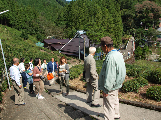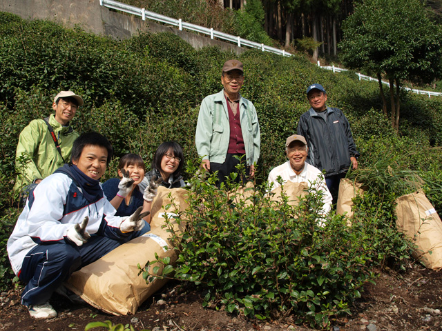 きっかけは今年9月に行われた「地域再生システム(特)論」という授業だった。フィールドワークである地域を実際に歩き、そこの抱える課題を探り、課題の解決策を提案するのである。初めて政所を訪れた日、茶農家の方に集落を案内していただきながら、茶にまつわる様々な話を聞いた。「先祖から守ってきたものを守りたい。『政所』の名前だけが残って茶が残らないのはみじめだ」という言葉に茶への誇りが込められていた。しかし集落を歩くと斜面に雑草が生え荒れた茶畑が目に入る。体力的にも手がまわらないのだという。「あそこなら好きにしていいよ」との言葉にメンバーの目が輝き、すべてが動きはじめた。