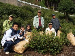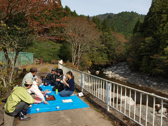 11月、さっそく茶畑を借りての活動が始まった。初日は草取り。たかが草取りと思っていたが、普段農作業をしていないとろくに草も取れない。それでも休憩時間には川縁にシートを敷いて、丁寧に湯冷ましで入れたお茶をいただく。これぞ「茶ミット(ちゃみっと)」。師走16日には畑に落ち葉を敷きつめにいく。雪が降るようになれば、家の中でゆっくりおばあちゃんたちにお茶の入れ方を習おう。春がくれば茶摘みができる。その時までにコスチュームの菅笠と襷と地下足袋を用意しよう。そして私たちの作ったお茶を飲みながらあちこちで「茶ミット」をやりたい。稀人の、夢はふくらむばかりである。
