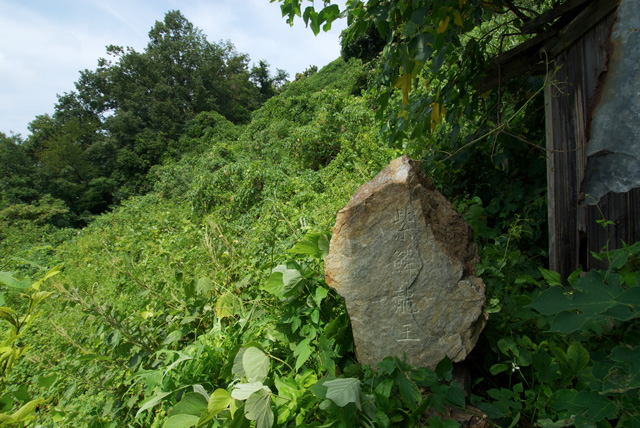 「紫鱗龍王」の場所は、石田三成の居城があった佐和山、「千貫井」のところである。かつては水神を祭る社だったのだろうと思われる構造物があり(今は傾いている)、その横に写真のような「紫鱗龍王」と刻んだ石があるのだ。