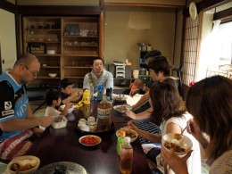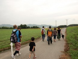 くらぶの活動はいたってシンプルなお散歩である。膽吹さんの案内で伊吹を毎回違ったコースで約1時間かけて歩く。春は桜並木の下を、冬は雪景色の中を、秋は稲刈り前の田の間をと、四季折々の伊吹の風景を楽しみながら歩くのだ。このくらぶのいいところはそれぞれが自分のペースで楽しめるということ。小さな子どもを連れてゆっくり歩く人もいれば、おしゃべりを楽しみながら歩く人、写真を撮りながら歩く人、それぞれが散歩のために早起きしたこの1時間を自分の好きな楽しみ方で過ごすのである。そして散歩の後は皆で一緒に伊吹産の食材を使った朝ご飯を食べる。食事を囲むと自然と会話が生まれ、人の輪が生まれる。「歩く」「食べる」という誰もが気軽にできることを通して、そこに居合わせた人たちのつながりが自然と生まれていくのだ。