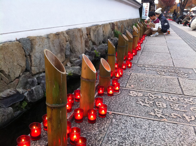 今年も「ひこねキャンドルナイト」が行われることになっている。夢京橋キャッスルロード界隈で約2万個のキャンドルに火が灯る。そのうちの300ほどが竹灯である。この竹、実は、「石田三成の茶の井(伝)」がある竹藪の竹を使っている。