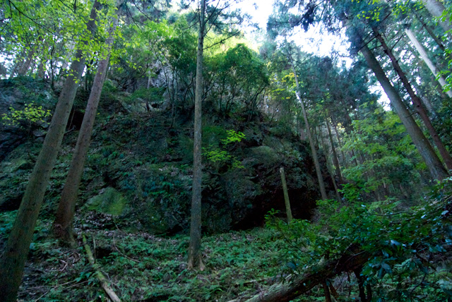 岩ヶ谷は、梓河内から山ひとつ東の小さな集落である。国道21号線から名神高速道路の下をくぐり集落のはずれから谷筋を登る。山道を300メートルほど行くと「大岩」と書かれた看板があるのだが、台風のせいだろう、道が判らない。ただ、高さ50メートルほどの巨大な岩の壁があり、これが天狗岩だろうと見当をつける。梵字が岩のどの辺りにあったかも思い出せない。とにかく、岩にとりつき周りを歩いてみるしかなかった。秋の夕暮れは驚くほどはやい。何か不思議なことがおこってもよさそうなくらい急に闇が混じる。