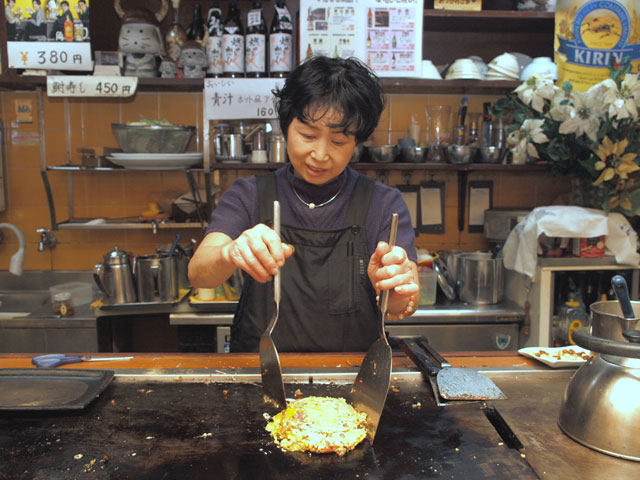 数あるベルロードの飲食店のなかでも、お好み焼き専門店「なかよし」は界隈の老舗といってもいい。25年の間、池中土佐子さんがひとりで切り盛りしてきた。