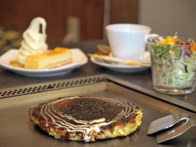 そんな矢羽野さんの思いを反映させたのが「デザートランチ(1050円)」だ。お好み焼きはバームクーヘン豚の豚玉、シーフード、もちチーズから、デザートはチーズケーキ(ソフトアイス添え)、ワッフルもなか、フォンダンショコラ(ソフトアイス添え)から選ぶ。サラダ、飲み物もつく。おにぎりとお好み焼きのランチセットもあるのだが、デザートランチは女性はもちろん男性の支持も高いそうだ。単品のスイーツや、ジャスミンティー・緑茶などお茶の種類も充実している。矢羽野さんは、研究を重ねるうちに小麦粉をはじめとする食材をほぼ滋賀県産のものでまかなうようになった。大阪の母の味には、滋賀のうまみが閉じ込められているのである。