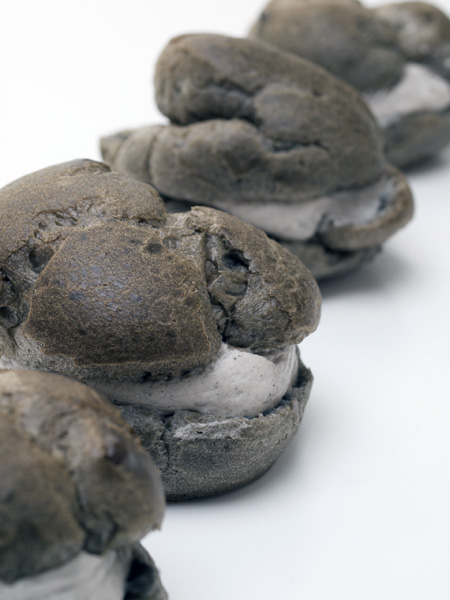旧愛知川町、中山道沿の和菓子店「吉福庵」が一昨年、彦根に洋菓子店「カシュカシュ」をオープン。「黒いシュークリーム」は両店舗を経営する吉川猛さんが、開店1周年を記念し創作したものだ。黒ごまのペーストを練り込んだ特製生クリームと、竹炭を配合したシュー生地とのグラデーションが美しい。