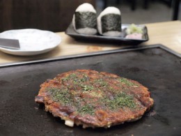 数種あるお好み焼きはメニューによってサイズが違う。私が注文した「特製さんきち焼」はイカとかしわ、豚肉が入っていて、「大きい方」に相当する。おにぎりも一緒に注文した。