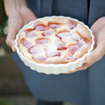 クラフティとはフランスのリムーザン地方の伝統的なお菓子です。タルト生地の中にチェリーを並べ、卵と牛乳、生クリームと砂糖を混ぜて焼き上げたものが一般的ですが、チェリーの代わりに今回は苺を使いました。