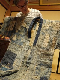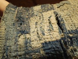 しかし、初めて出雲さんに出会ったとき、その手にしていたものは、まぎれもなく「ぼろ」だった。一枚の布とは言い難い。細かな布の集合体が一枚の布の態をなしている。原型などとうにわからない。敷いたり、包んだりすることに用いられただろうその布は、ぼろぼろに擦り切れ、繕われ継がれあてがわれ、それがまた擦り切れている。そうした箇所は一カ所だけでなく、また一時に施されたものでもない。布片は多くが藍染めで、その藍の濃淡と、布の破れや汚れ、縦横に走る縫い糸などが入り乱れ、そのはげしさに、まばゆいとさえ感じた。「ぼろぼろ」というだけでは言い尽くせない。「ぼろ」は、それを用いて野良で働く男と、それを繕う女との、気の遠くなるような営みが重ねでできている。目が離せなくなってしまった。