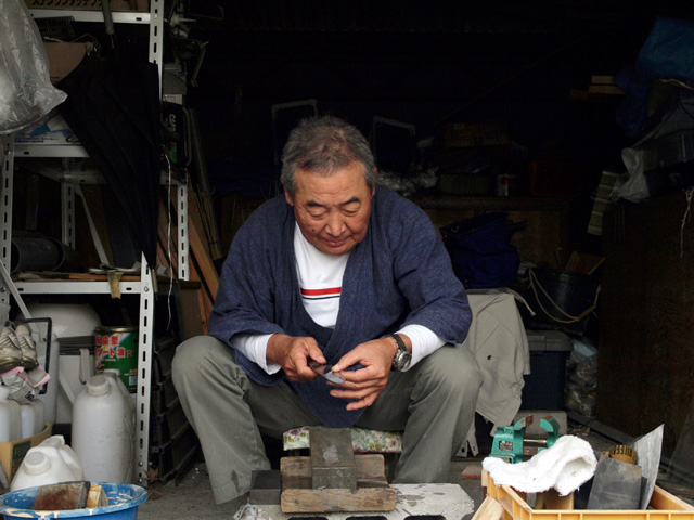 彦根・花しょうぶ通り商店街、「村川商店」の店先で見つけたのぼりだ。村川商店はタバコや有機栽培食品を扱っている。尋ねてみると、「包丁を研いでくれる方への取り次ぎをしている」のだという。どんな人がどんな風に研ぐのだろう……取り次いでもらい、小菅一宏さん(72)にお会いした。