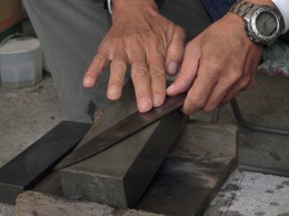 作業場へ案内していただいた。刃を砥石にあてる角度や、砥石の種類、仕上げ……研ぎながら説明していただく。「預かった包丁から、どんな人が使っているんだろうなあと想像しますね」。刃物だけではなく、すべての道具は本来こんな風に扱われてきたはずなのだ。