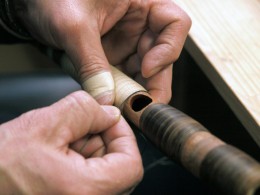 古典笛の制作には30〜40もの工程がある。笛の本体は竹だが普通の竹ではいけない。茅葺き屋根に使われてきた煤で真っ黒になった女竹を使う。100年以上の長い時を経て、竹に浸み込んだ煤が独特の響きを作る。笛のサイズに合う竹を探し、唄口と指孔を調律しながら穴を開け、内面に漆を何度も重ね塗る。笛の表面を飾るのは染色した籐の糸だ。すべて天然素材、伝統の手作業で、1管の完成には少なくとも2ヶ月かかるという。