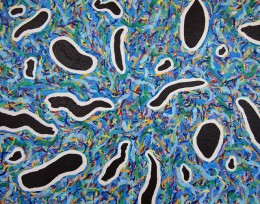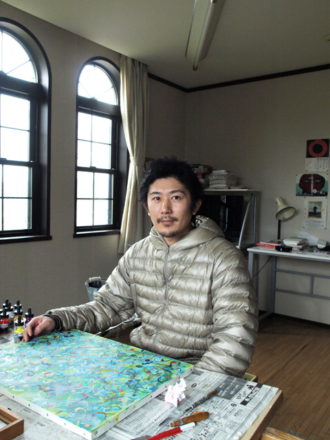 彦根市にお住まいの眞野さんは、アクリル絵具などを使って絵を描いている。ジャンルでいうならば抽象というのだろうか、模様や形、ときには生き物らしきものが描かれている。原色の色使いが多い。「こういうことを描こう、表現しようと描いているものではないんです。コンセプトもありません。社会的、集合的なエネルギーの変化をオートマティックに描いています」と眞野さんは説明する。