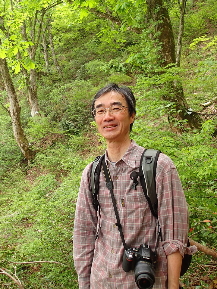 橋本さんは、大阪生まれ。2009年に父親の実家である西浅井町山門に移住してきた。山門を拠点に何かしようと考えていたところに、県の琵琶湖森林レンジャー活動事業で山門水源の森の調査・保全を行う仕事が見つかり、森林レンジャーとなった。2012年からは長浜市の職員として山門水源の森の他にも、深坂古道や奥琵琶湖パークウェイなどにもフィールドを広げて活動している。