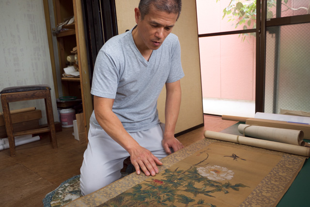 表具屋の2代目である清水さんがこの仕事に専念するようになったのは8年ほど前。それまではサラリーマンとして働く傍ら、主に襖の貼り替えなどをする家業を手伝っていたという。20代頃、お父さんの仕事場に積まれた紙の山の中に、明治時代の地元の作家の葉書をたまたま見つけた。お父さんは掛け軸の仕事は手掛けなかったが、清水さんは独学で掛け軸の勉強を始めた。そうしているうちに、書画家に興味が深まっていったという。
