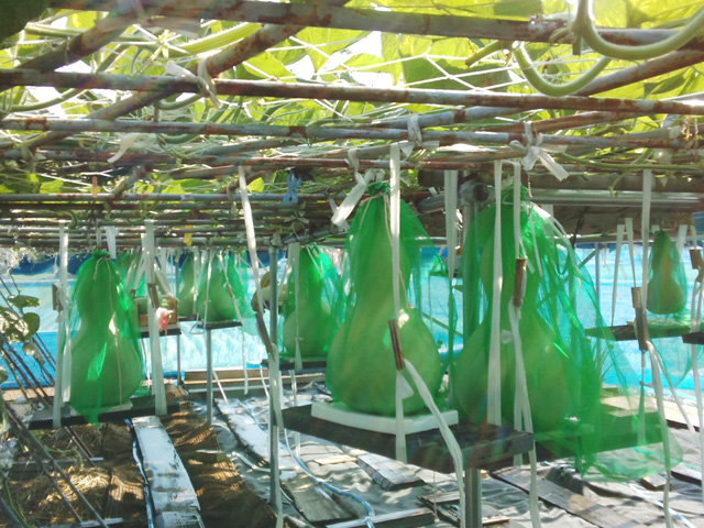 藤野さんと瓢箪の出会いは5年前。退職して時間ができたところに、親類から「瓢箪を育ててみては」と苗をもらったことがきっかけだった。何も知らずに育てた1年目の瓢箪は失敗だったというが、人に瓢箪を分けてもらい、色を重ね塗って研ぎ出す技法を試しにやってみた。教えられたことを何も分からずにただやってみたというが、最初から県の展示会で金賞を受賞。全国大会にも出展し、「瀬戸内海放送局長賞」を受賞してしまったという。