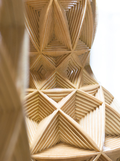 ひとつの瓢箪を加工したもので、藤野さんが考案した「落とし込み」という技法なのだという。例えば小さな三角形の形をカッターで切る。切った三角形を、慎重に「こんこん」と叩き、瓢箪の厚み(1センチほど)の半分、つまり5ミリほど落とす。そしてその周りをまた同じ形に切り、5ミリ落とす。その作業の連続で、この立体的な幾何学模様がつくられるのだという。技法に辿りつくまで半年ほど、制作にはふたつで合計800時間ほどかかっているという。この瓢箪こそが全国愛瓢会主催の展示会で「内閣総理大臣賞」を受賞した瓢箪だった。