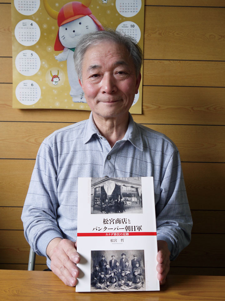 今月、「松宮商店とバンクーバー朝日軍 カナダ移民の足跡」という本が発行された。著者は、彦根市開出今町在住の松宮哲さん(69)だ。戦前にカナダ・バンクーバーで活躍した日系人野球チーム「朝日」を描いた映画「バンクーバーの朝日」が公開されたのは2014年末。その時以来、DADAジャーナルが松宮さんをお訪ねするのは二度目である。「映画の公開を知り、父の増雄が記した『開出今物語』に朝日のことが書いてあったのを思い出しました。以来、朝日について調べ始めました」と、当時松宮さんは語ってくれている。バンクーバーの日本人街、パウエル街で「松宮商店」を営んでいた松宮さんの祖父・外次郎氏は、「朝日」の設立にかかわり、初期に部長も務めていたのである。